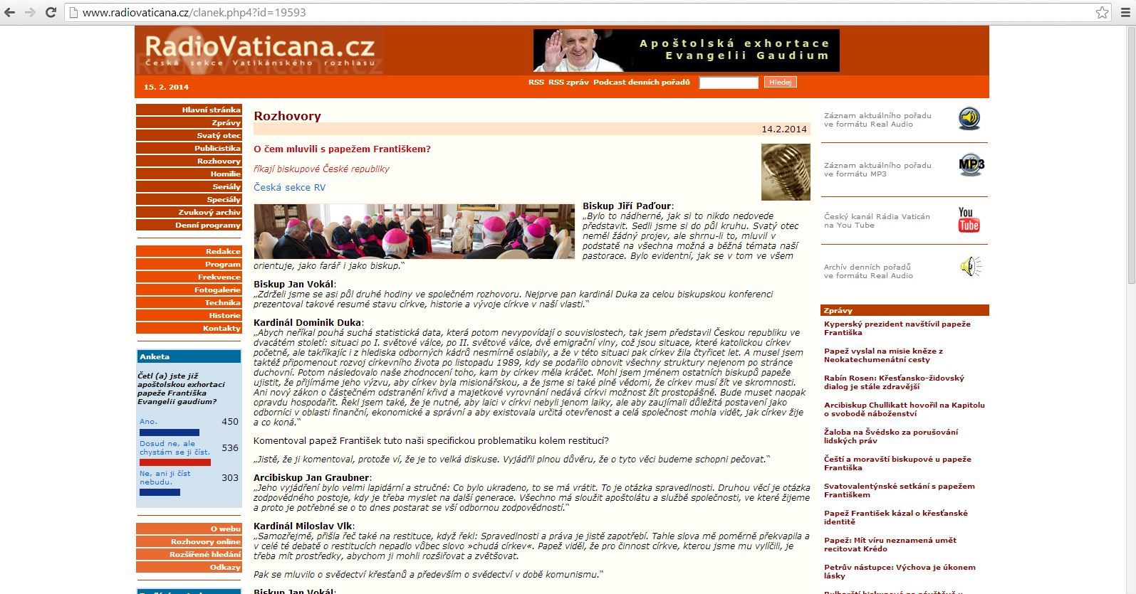 Radio Vatican](http://www.radiovaticana.cz/clanek.php4?id=19593) a publié l’interview d’un évêque de République Tchèque suite à sa rencontre avec le Pape le 14 février lors de sa visite ad limina . Mgr Jan Graubner, archevêque d’Olomuc , indique que le Saint-Père a évoqué la messe dans la forme extraordinaire.