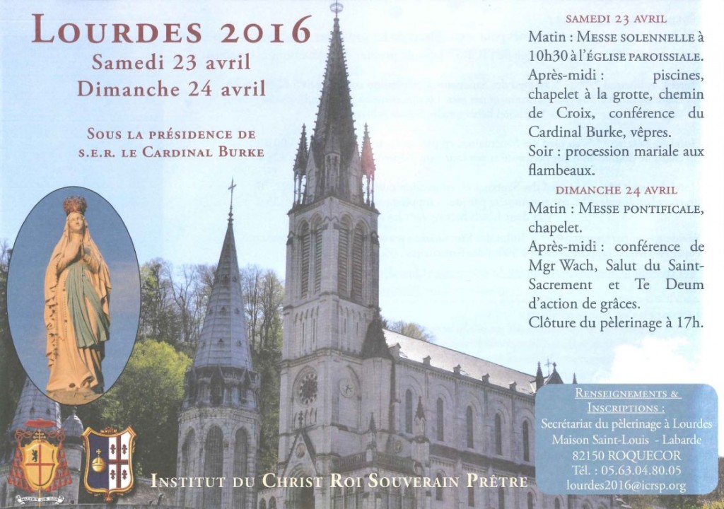 L’ Institut du Christ Roi propose son traditionnel pèlerinage à Lourdes les 23 et 24 avril prochain . Ce Pèlerinage sera présidé par SE le cardinal Burke.
