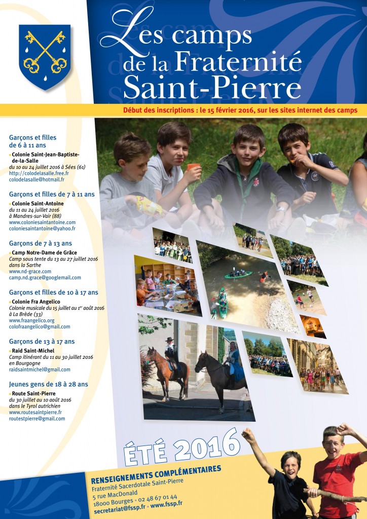 Comme chaque année, la Fraternité Saint-Pierre propose des camps, colonies ou routes pour les 6 à 30 ans. Encadrées par des séminaristes, des prêtres et quelques laïcs, ces camps de jeunes sont très demandés.
