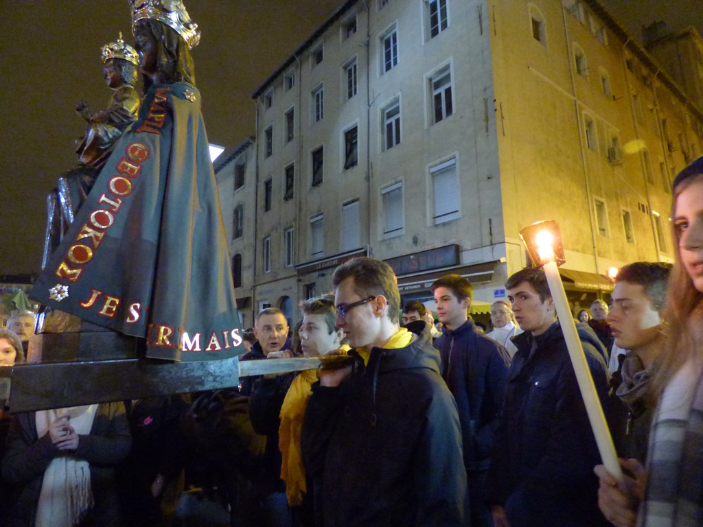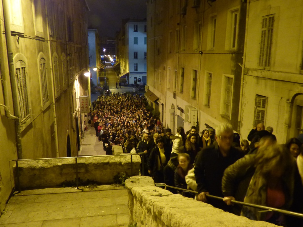 A la suite de Notre-Dame de Confession, ils sont partis vers l’abbaye de Saint -Victor en chantant et en priant dans les rues de Marseille.Face à la ville, Mgr Pontier a béni les cierges et la cité.