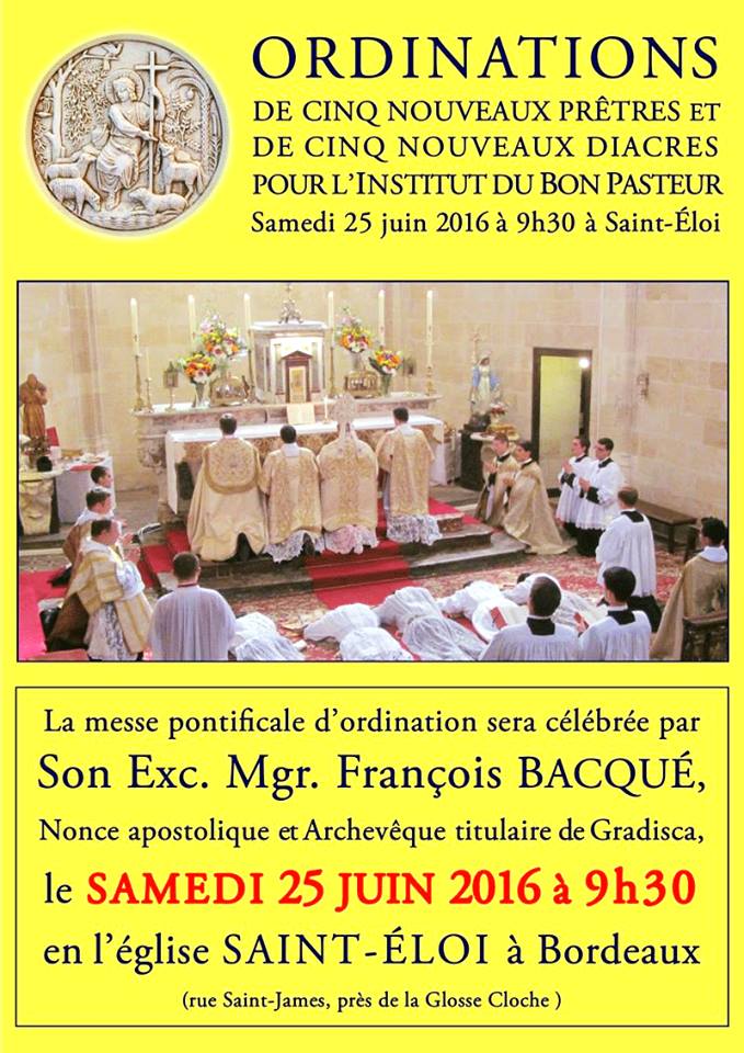 L’ Institut du Bon Pasteur vient d’annoncer ses prochaines ordinations sacerdotales et diaconales le 25 juin à Bordeaux (5 prêtres et 5 diacres).