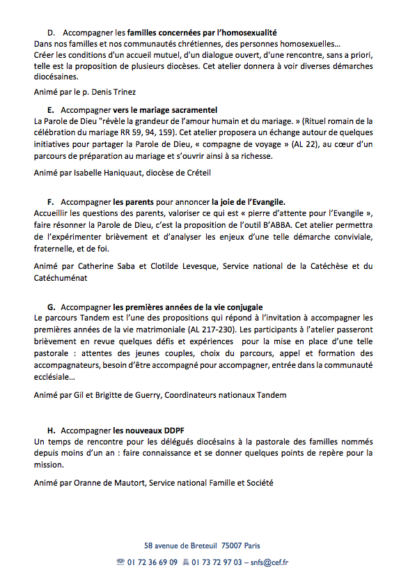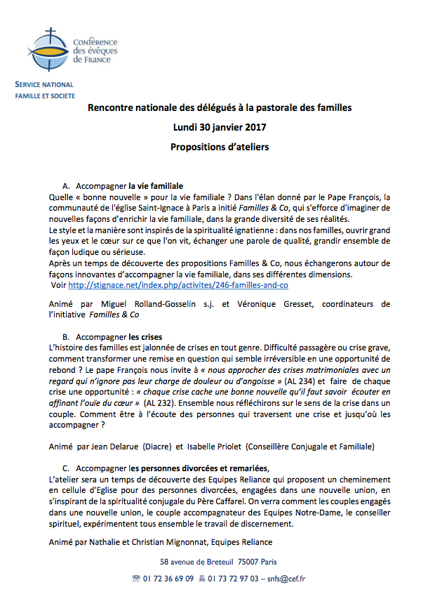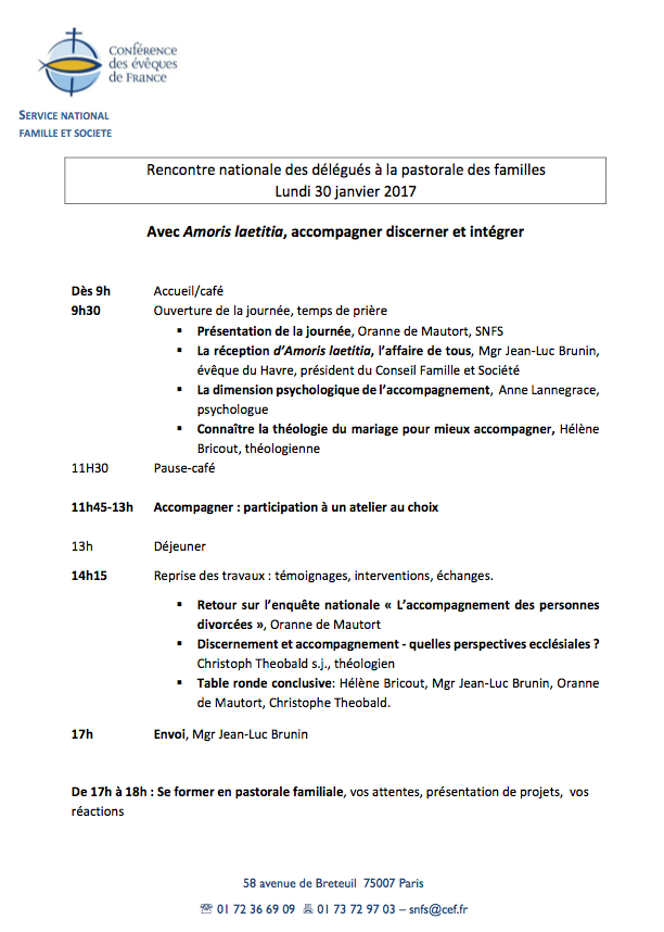 Vous êtes attendus à la rencontre nationale lundi 30 Janvier 2017 « Avec Amoris laetitia, accompagner , discerner et intégrer» . Thème majeur que vous êtes nombreux à travailler activement ; j’espère que cette journée vous aidera dans votre mission.