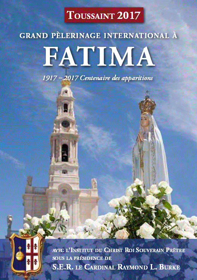 Grand pèlerinage international à Fatima sous la présidence de S. E. R. le Cardinal Burke avec l’Institut du Christ Roi Souverain Prêtre à la Toussaint 2017 (du 2 au 4 novembre ou du 31 octobre au 4 novembre,n selon la formule choisie) :