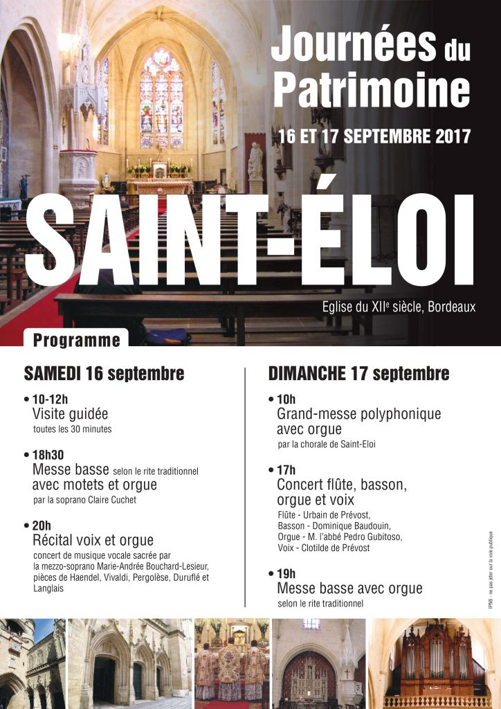La paroisse Saint-Eloi à Bordeaux (Institut du Bon Pasteur) propose de venir découvrir cette église bordelaise et ses richesses spirituelles et liturgiques à l’occasion des Journées du Patrimoine les 16 et 17 septembre :