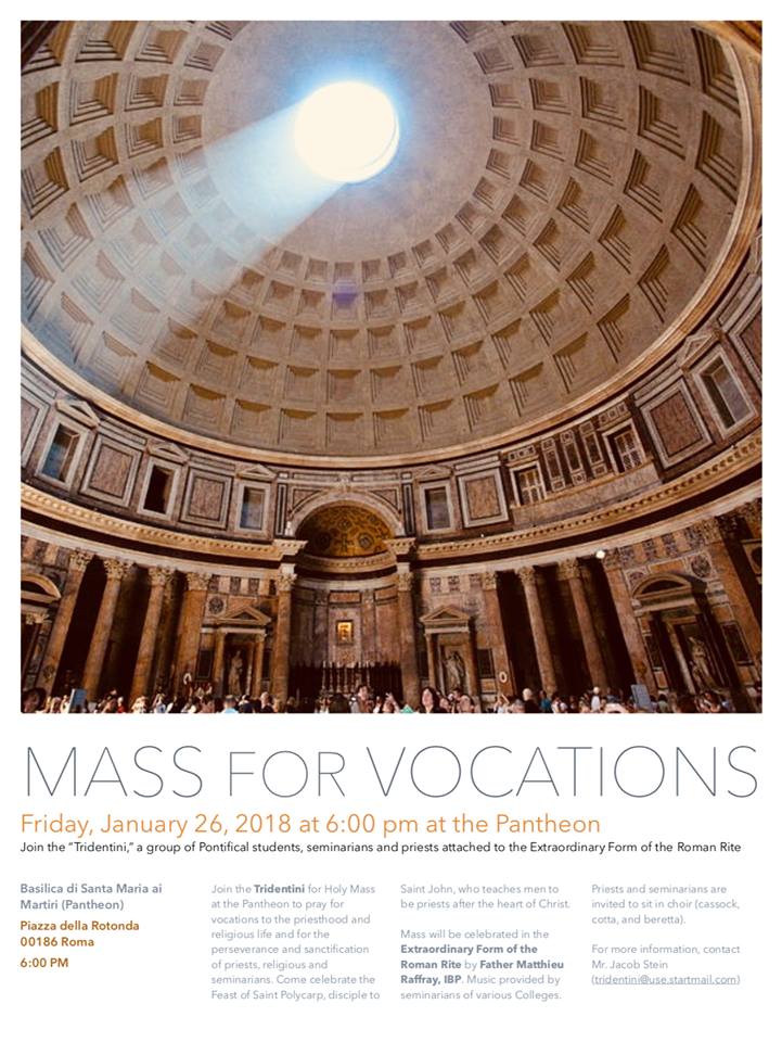 Une messe pour les vocations sera célébrée par l’abbé Mathieu Raffray, IBP au Panthéon (Rome) le vendredi 26 janvier 2018