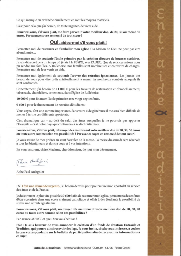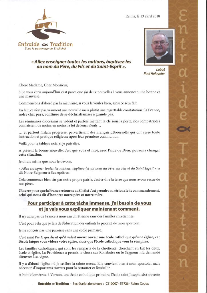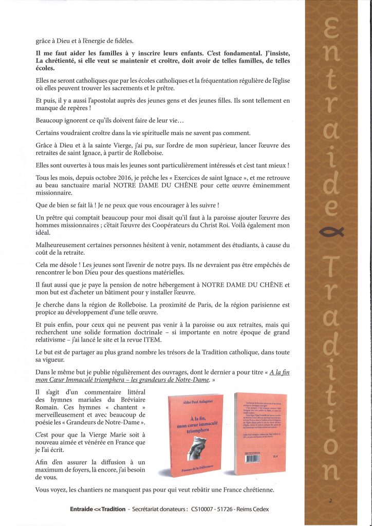 Au courrier, nous recevions ces jours-ci l’ appel de l’abbé Paul Aulagnier qui souhaite soutenir via Entraide & Tradition : une école dans la région de Vernon, la restauration de l’église de Rolleboise (qu’il dessert depuis quelques années) et l’oeuvre de retraites ignatiennes de l’Institut du Bon Pasteur qu’il dirige depuis 2016. Il recommande également la lecture de son dernier ouvrage sur les hymnes mariales .