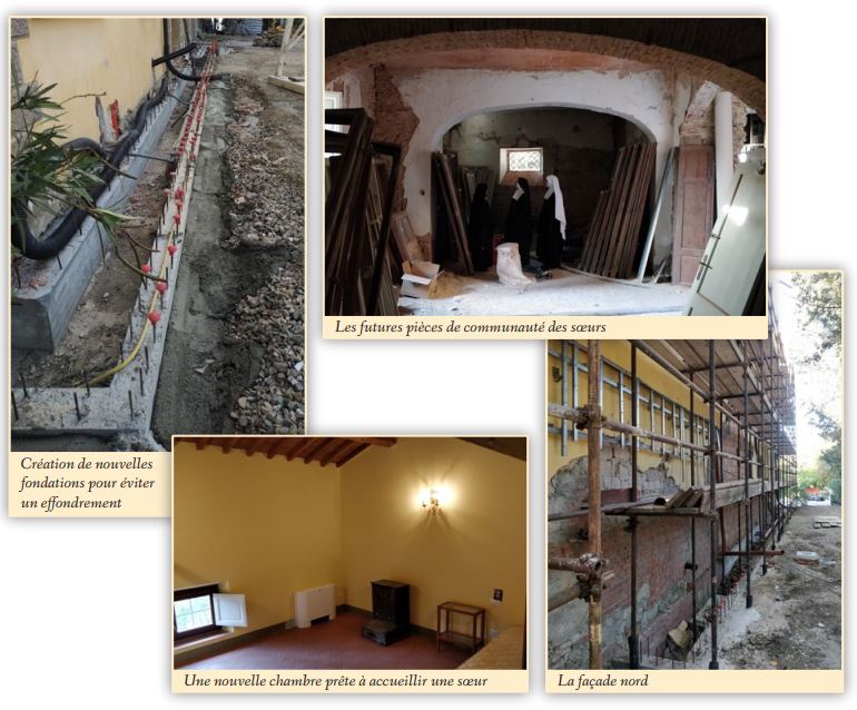 Toutes ces années de restaurations nous ont permis de finir les toits en 2010, et maintenant le deuxième étage, ainsi qu’une bonne partie du premier étage. Cependant, elles nous ont permis de constater la gravité des désordres structurels au niveau de la façade nord, qu’il nous était impossible d’entrevoir avant les travaux : une sérieuse faiblesse des fondations, ainsi qu’une mauvaise évacuation des eaux usées, qui les ont endommagées ces dernières décennies. Une partie plus fragile du mur s’est d’ailleurs affaissée pendant les travaux, et pouvait laisser craindre un effondrement d’une partie de la maison. Ces derniers mois, nous avons dû creuser des tranchées autour de la maison, reprendre le système d’évacuation des eaux usées et créer de nouvelles fondations afin que la maison se stabilise. Vous vous en doutez, tout ceci a un coût supplémentaire qui nous oblige a reconsidérer l’ensemble du projet. Ce sont entre 400 000 et 450 000 euros qui manquent à ce jour, et nous voici obligées d’arrêter le chantier de restauration intérieure, étant dans l’impossibilité de payer l’entreprise.