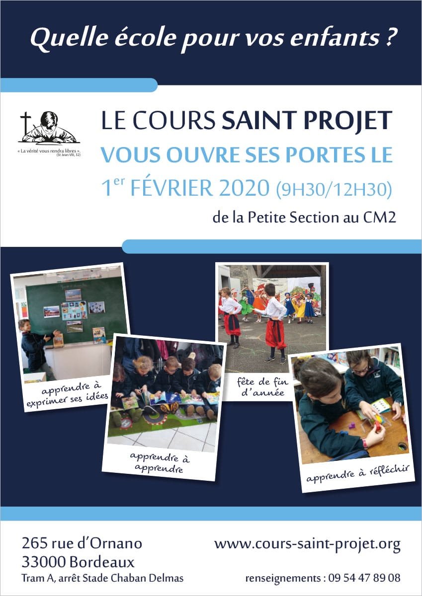 Le Cours Saint-Projet, école maternelle et primaire à Bordeaux, vous invite à sa journée portes-ouvertes le 1er février. L’école compte une centaine d’élèves. L’aumônier est assurée par des prêtres de l’Institut du Bon Pasteur (Paroisse personnelle Saint-Eloi à Bordeaux).