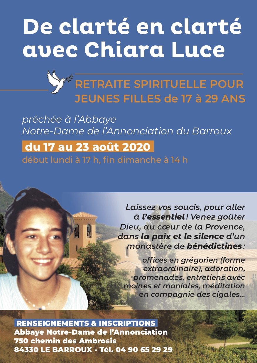 Comme chaque année en fin d’été, une retraite spirituelle pour jeunes filles de 17 à 29 ans est prêchée à l’Abbaye Notre-Dame de l’Annonciation du Barroux du 17 au 23 août 2020.
