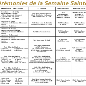 Voici les horaires de la Semaine Sainte dans les lieux de culte desservis depuis le prieuré de Nantes de la FSSPX (églises Saint-Emilien de Nantes et de la Placelière, chapelle de Pornichet, cours St Albert et au Rafflay).