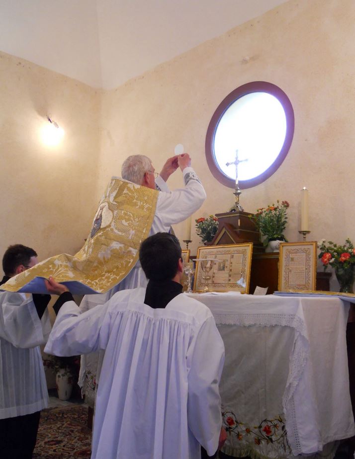 L’abbé Benoît de Jorna, Supérieur du District de France de la Fraternité Saint-Pie X, vient de bénir le lundi 17 mai dernier la nouvelle chapelle de la Fraternité à Pontmain . Cette chapelle dépend du Prieuré du Moulin du Pin à Beaumont-Pied-de-Boeuf (nord-ouest de Sablé-sur-Sarthe). Avec Laval, il s’agit du 3è lieu de culte stable dans le département. Les prêtres du prieuré desservent également Le Mans et Alençon.