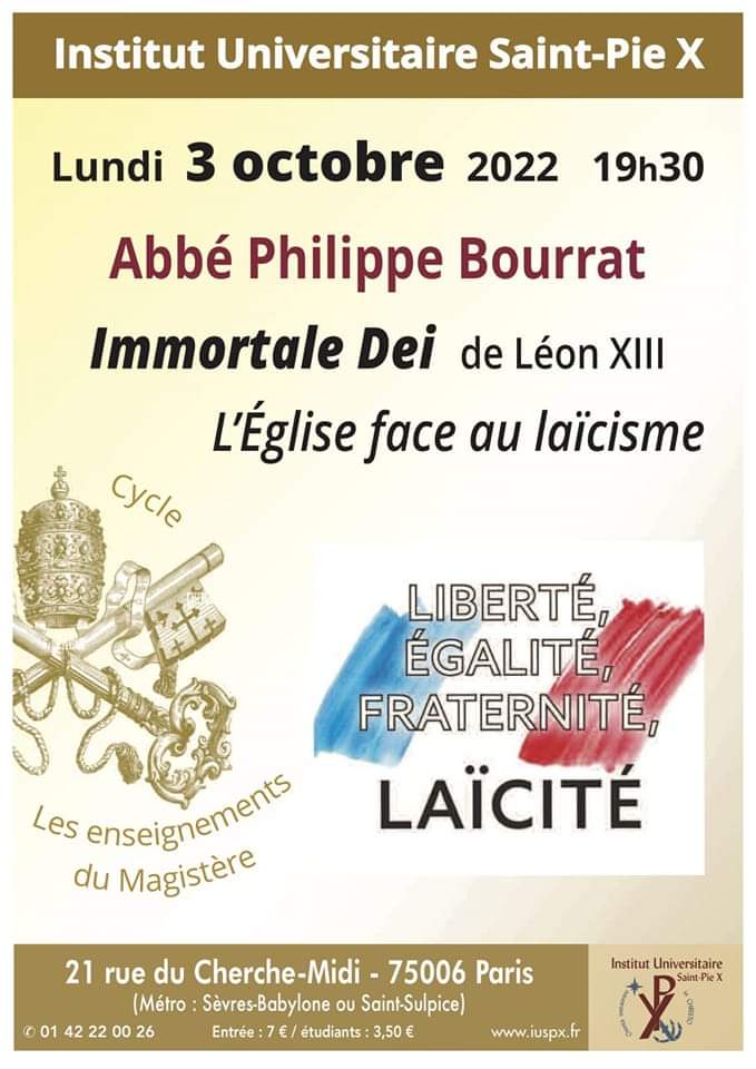 L’Institut Universitaire Saint-Pie X propose une conférence sur le laïcisme ce lundi 3 octobre.