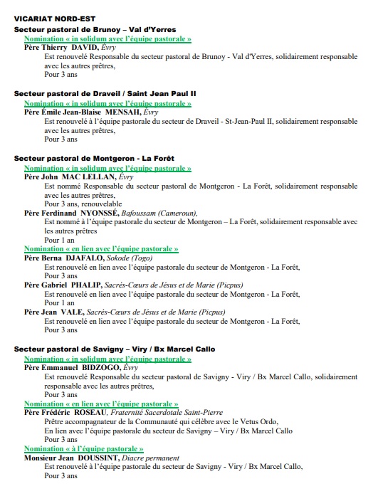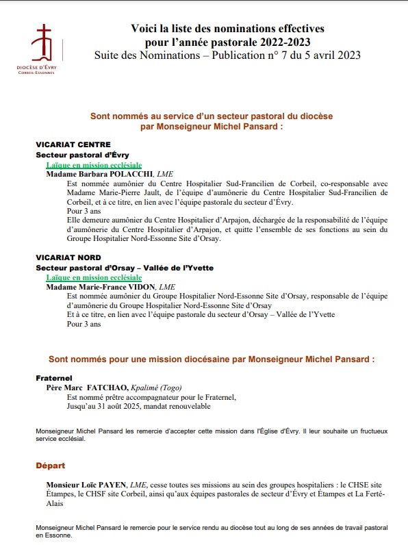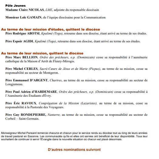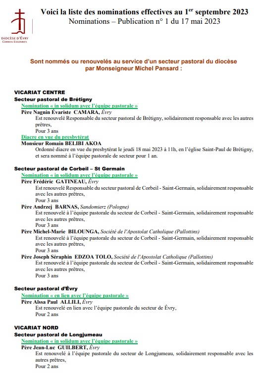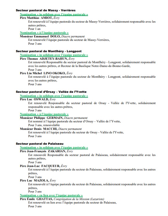 Le diocèse d’Evry a publié des nominations pour septembre prochain, en plusieurs vagues