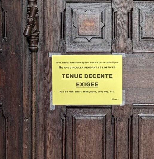 « le respect des religions quelles qu’elles soient, est inscrit dans la loi du 9 décembre 1905. Les communautés catholiques du diocèse d’Angers sont heureuses d’accueillir toute personne et les touristes estivaux en particulier, pour les dimensions cultuelles et culturelles dans les églises qui leur sont affectées ». « Comme pour tout lieu de culte, des règles simples existent ; cet écriteau tente de les rappeler afin que soient respectés l’esprit du lieu et les personnes qui s’y recueillent. »