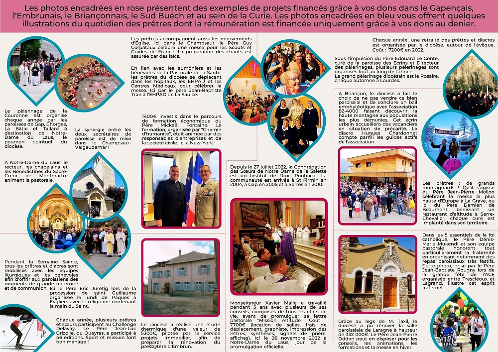 En revanche, il donne quelques projets réalisés avec des legs, des dons (comme celui pour la rénovation de la salle paroissiale de Laragne, 330.000 euros) ou les revenus courants du diocèse – on y apprend qu’un curé a été formé – moyennant 1400 euros – aux affaires économiques par Chemins d’Humanité, qui a le but certes louable de faire découvrir l’entreprise aux prêtres et de les former en s’appuyant sur un « réseau de cadres dirigeants », mais visiblement pas gratis pro Deo .