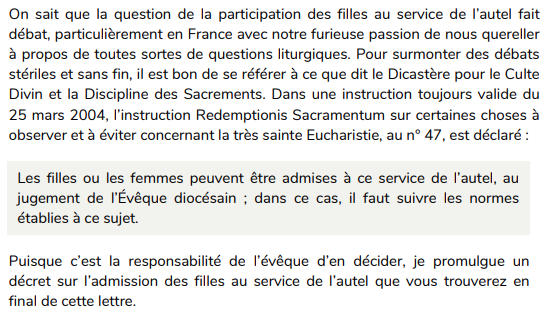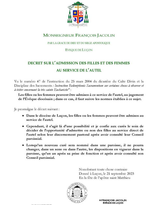 A la suite d’un décret paru l’an dernier, Mgr Jacolin , évêque de Luçon, a publié une lettre pour préciser (en renvoyant le sujet aux curés) le service de messe pour les filles et la réception de la Sainte Eucharistie. Extraits :