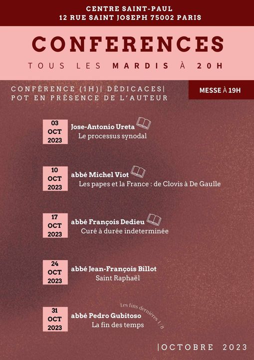 Le Centre Saint-Paul (12 rue Saint-Joseph – 75002 Paris) vous convie aux conférences du mardi :