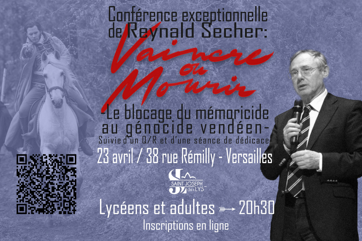 Le mardi 23 avril à 20h30, Reynald Secher donnera une conférence sur le thème : « Vaincre ou Mourir » : le blocage du mémoricide au génocide vendéen (Durée 1h30), suivi d’une séance de Questions / Réponses, puis Dédicace du DVD du film à l’école Saint-Joseph-des-Lys à Versailles (38 rue Rémilly). La conférence est ouverte à tous (amis, voisins…). Participation libre.