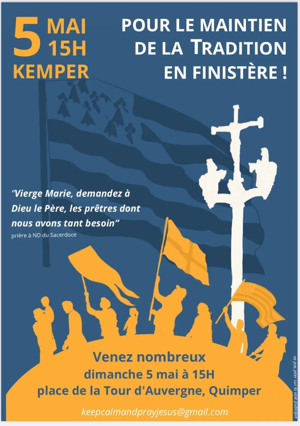 Suite à l’ annonce en décembre de l’éviction de la Fraternité Saint-Pierre du diocèse de Quimper , les fidèles de Quimper et Morlaix attachés à la messe traditionnelle étaient restés silencieux souhaitant échanger avec l’évêque en vue de trouver une solution. N’ayant aucune réponse à leurs questions, les fidèles sont contraints de manifester.