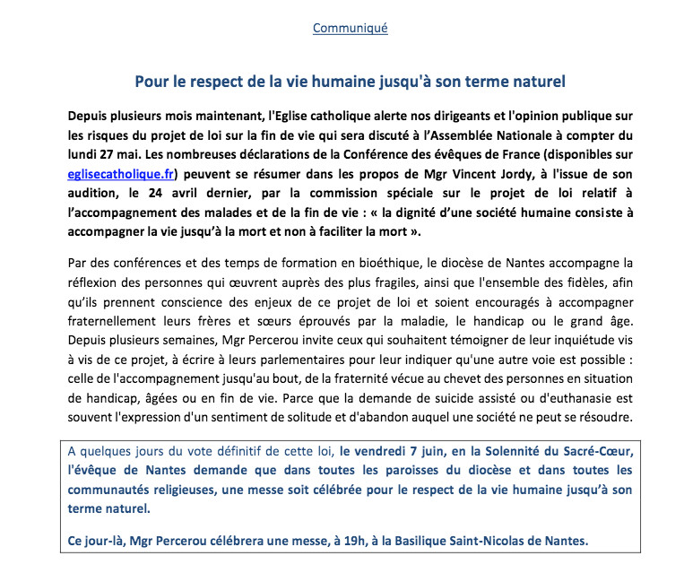 Loi sur l’euthanasie : L’évêque de Nantes veut une messe dans toutes les paroisses