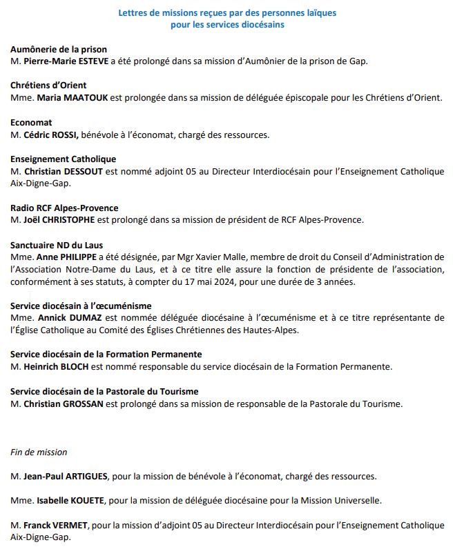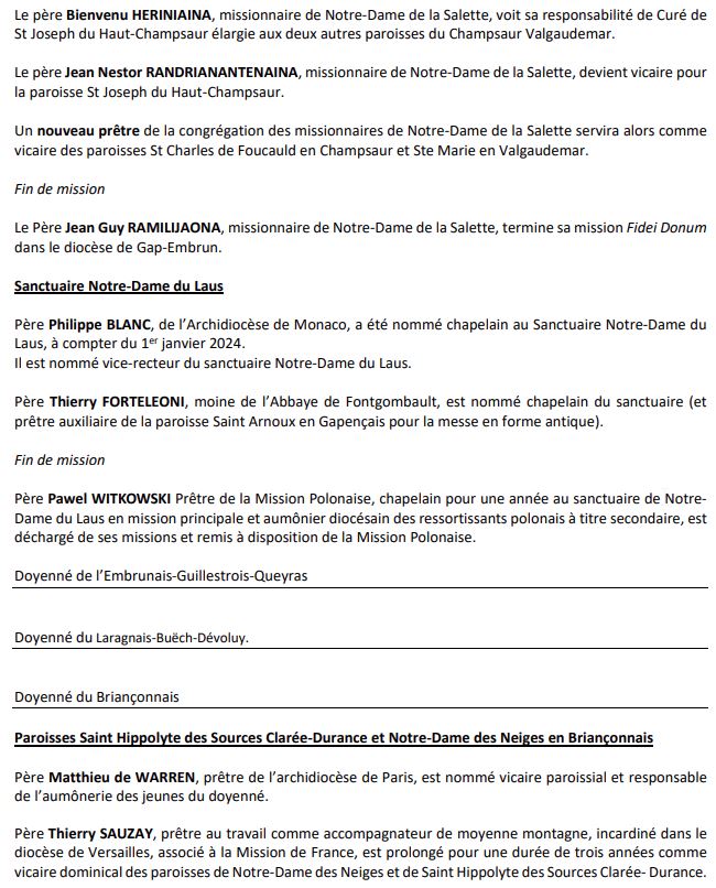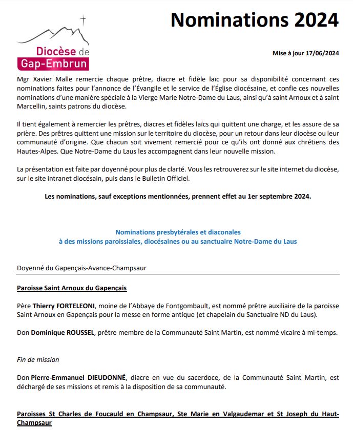 Parmi les nominations du diocèse de Gap, l’arrivée d’un moine de Fontgombault comme prêtre auxiliaire à Gap pour la messe « en forme antique » et chapelain au Laus :
