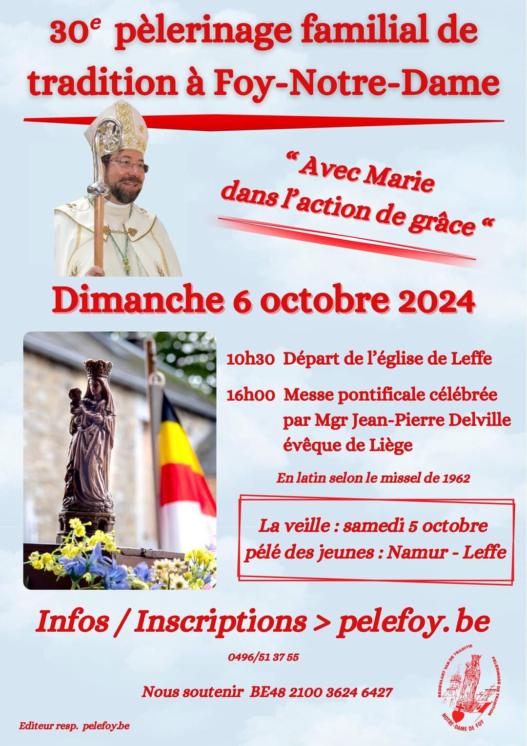 30è Pèlerinage familial de tradition à Foy – Notre-Dame (Belgique) sur le thème « Avec Marie dans l’(action de grâce ». Mgr Jean-Pierre Delville, évêque de Liège, célèbrera la messe pontificale de clôture.