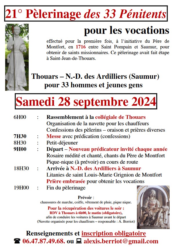 Le 21è Pèlerinage des 33 Pénitents pour les vocations de Thouars à Saumur aura eu lieu le 28 septembre. L’aumônerie est assurée par la Fraternité Saint-Pie X.