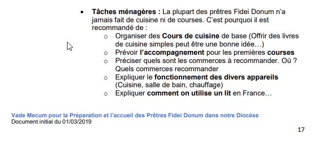 On y trouve quelques perles, comme le conseil d’ « expliquer comment ça fonctionne » au sujet de la literie. Ou l’affirmation suivante « : la plupart des prêtres Fidei Donum n’a jamais fait de cuisine ni de courses « .