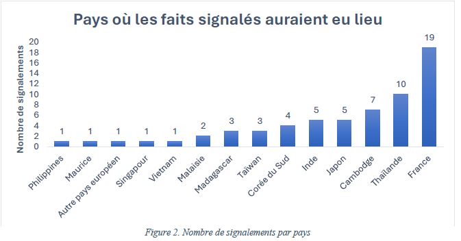Parmi celles-ci, « 30 allégations, soit près de la moitié des signalements, concernent des violences sexuelles sur des personnes de moins de 18 ans. Les allégations de violences sexuelles sur adultes concernent 13 signalements « . Géographiquement, « le plus grand nombre d’incidents a été signalé en France (19), tandis qu’un nombre important de signalements sont été faits en Thaïlande (10) et au Cambodge (7) ». Les auteurs du rapport expliquent cette prévalence des cas en France par le fait que « la grande majorité des prêtres MEP sont français et retournent en France régulièrement. Certains ont même passé des périodes prolongées en France pour y travailler, incardinés dans un diocèse en France après leur retour de mission par exemple « . Il est par ailleurs possible que « le contexte français ait été plus favorable au signalement des incidents, ou à la détection de comportements problématiques « .