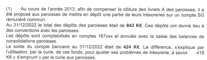 Le diocèse est aussi plombé par des affaires anciennes – ainsi, la créance de l’abbé Videau, ex-économe du diocèse de 1986 à 2004 condamné en 2010 à trois ans de prison ferme ( huit mois ferme en appel en 2011) pour avoir détourné jusqu’à 2 millions d’euros au préjudice du diocèse et du legs de Mgr Arrighi, court toujours – en 2015, elle avoisinait le million d’euros, et on la retrouve dans les comptes 2023, rangée dans les créances pour un montant 1.009.080.67 euros, puis dans les provisions pour dépréciations (page 10).