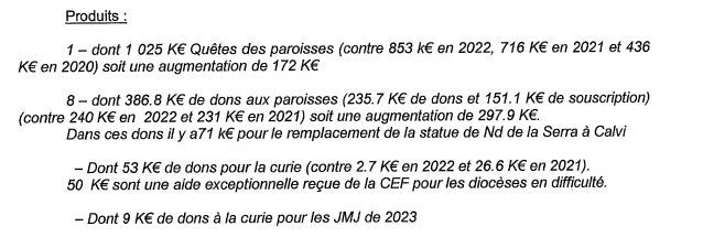 Dans les faits significatifs de l’exercice (page 26), le commissaire aux comptes relève aussi le décès de l’économe diocésain Patrick Bouis et l’embauche de Mme Rodeville-Pelletier pour le remplacer, l’audit général du diocèse début 2023, le redémarrage du projet de nouvelle église à Porticcio avec un nouvel architecte – le précédent, d’un coût de 2 millions d’euros, était hors de portée financière du diocèse, seuls 848.000 euros figurent actuellement dans le « fonds dédié Porticcio » (page 28).
