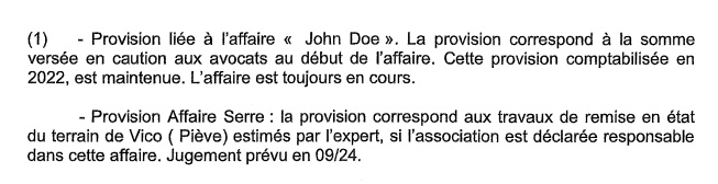On relève encore parmi les 28.722 euros de provisions pour risque une étonnante « provision John Doe » et une autre liée à un litige quant à la remise d’un état à Vico. On retrouve page 37 cette affaire orthographiée différemment (affaire John Doh) avec « 6.4 kE d’honoraires liés à l’affaire John Doe contre 33 kE en 2022 » et « 20 kE de provisions pour risque et charges liées à l’affaire Serre, contre 51K en 2022 (affaire John Doh) « .