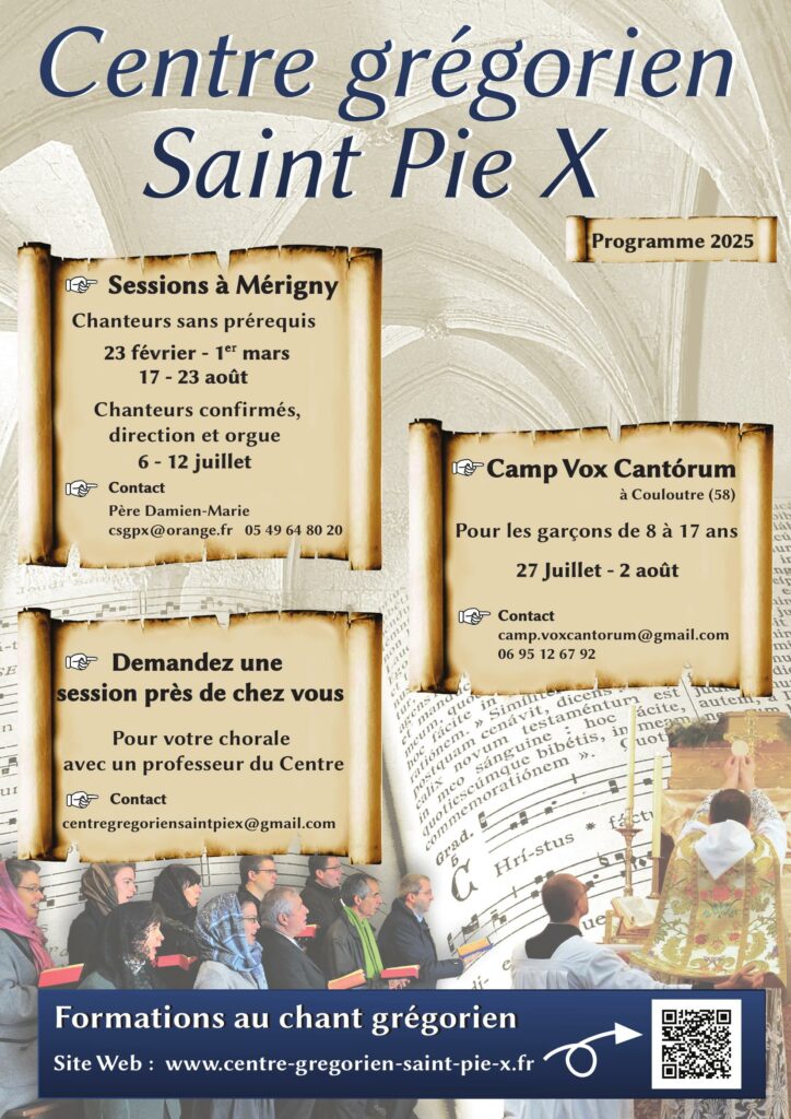 Le Centre Grégorien Saint-Pie X , sous l’égide de la Fraternité de la Transfiguration (Mérigny) et soutenu par la Fraternité Saint-Pie X, propose plusieurs sessions de grégorien en 2025 :