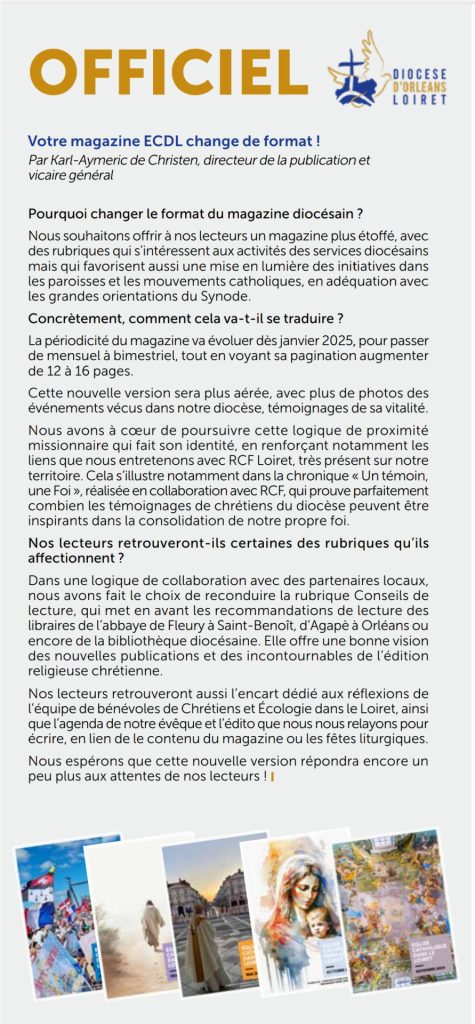 La revue diocesaine d’Orléans (ECDL – Église catholique du Loiret) change aussi de format – à partir de début 2025, elle n’est plus mensuelle, mais bimestrielle, et aura quatre pages en plus (de 12 à 16), avec moins de textes et plus de photos.