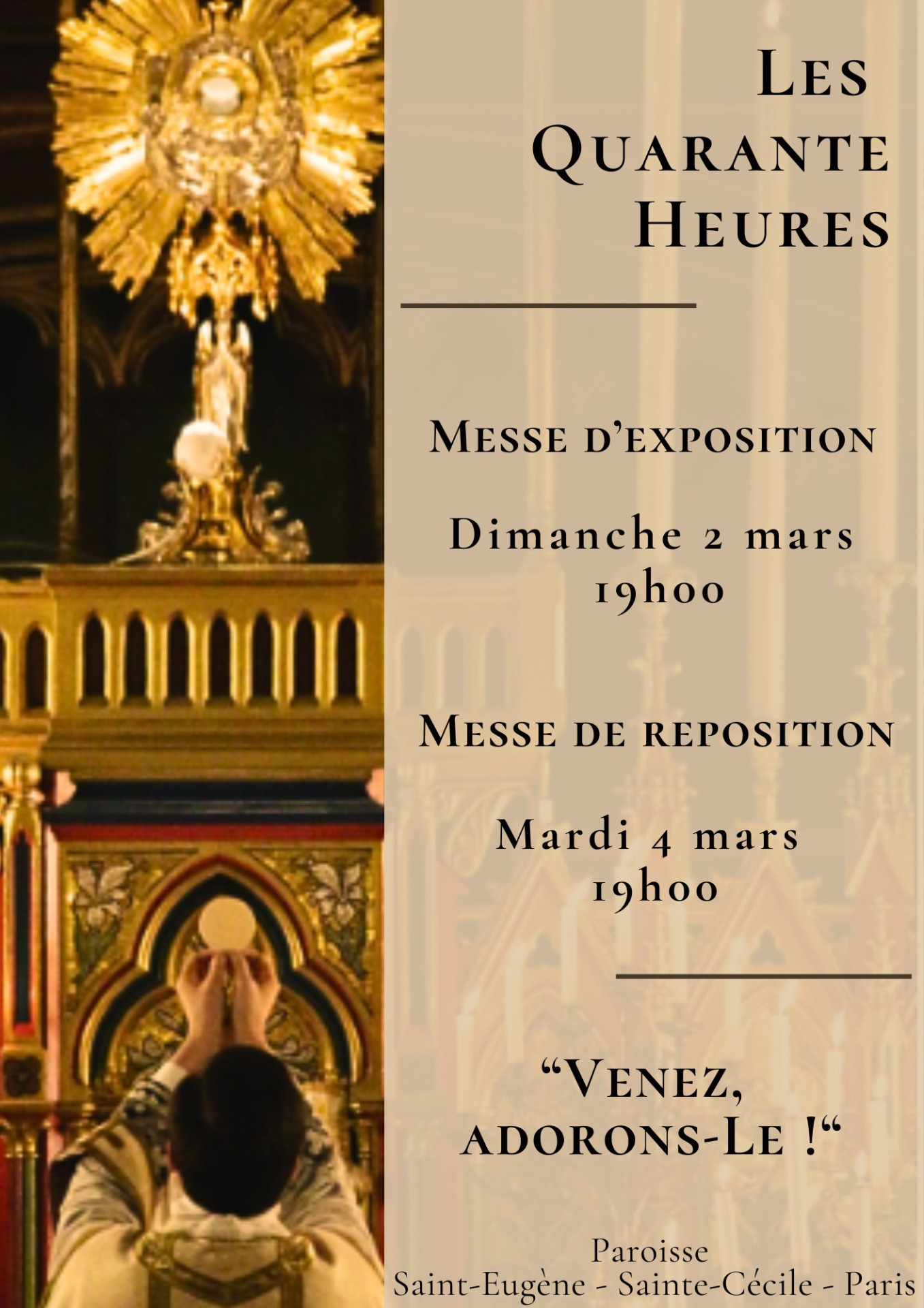 La Paroisse Saint-Eugène-Sainte-Cécile (Paris IXè) a repris depuis plusieurs années déjà cet antique usage des Quarante heures pendant lesquels le Saint Sacrement est exposé pour y être vénéré par les fidèles.