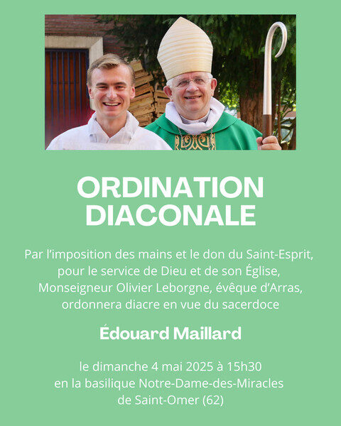 Le 4 mai prochain, Mgr Leborgne va ordonner le séminariste Edouard Maillard diacre en vue du sacerdoce, à 15h30 en la basilique Notre-Dame-des-Miracles de Saint-Omer (62).