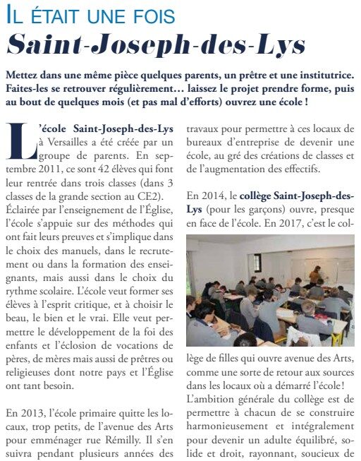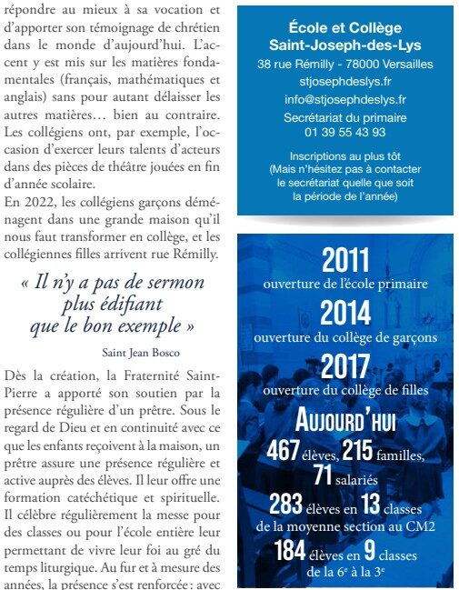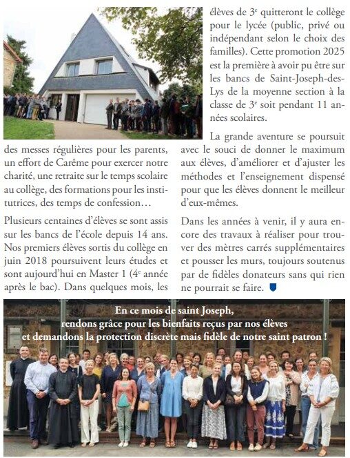 Dans ce numéro (n°49, Mars 2025), la Gazette de la Fondation Kephas présente l’Ecole et le Collège Saint-Joseph-des-Lys , école (mixte) et collège (non mixte) situés à Versailles et fondés par des parents en 2011. La Fraternité Saint-Pierre en assure l’aumônerie.