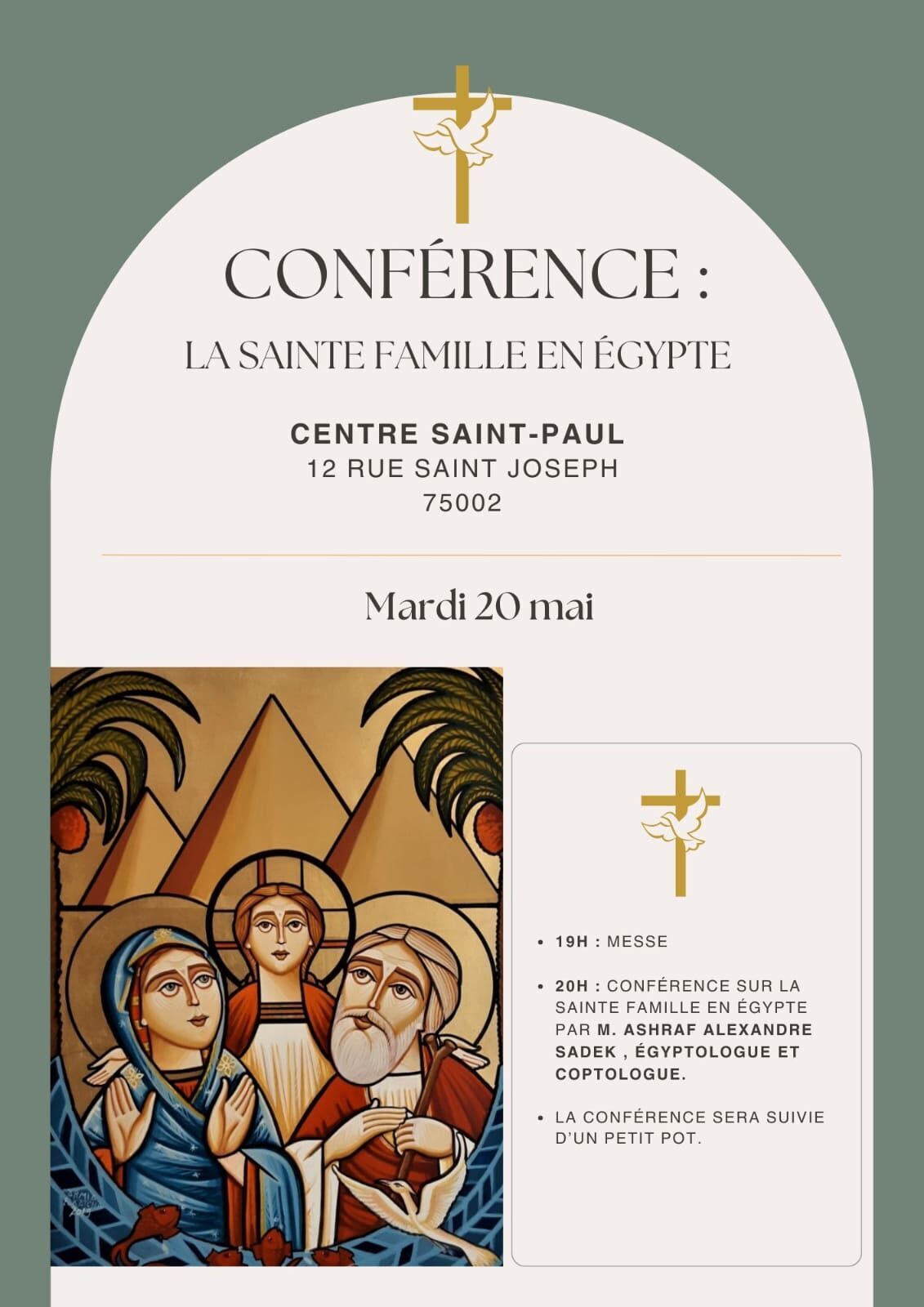 Le Centre Saint-Paul (Institut du Bon Pasteur à Paris) propose une conférence sur la Sainte Famille en Egypte ce mardi 20 mai à 20h30 au Centre Saint-Paul à Paris (12 rue Saint-Joseph).