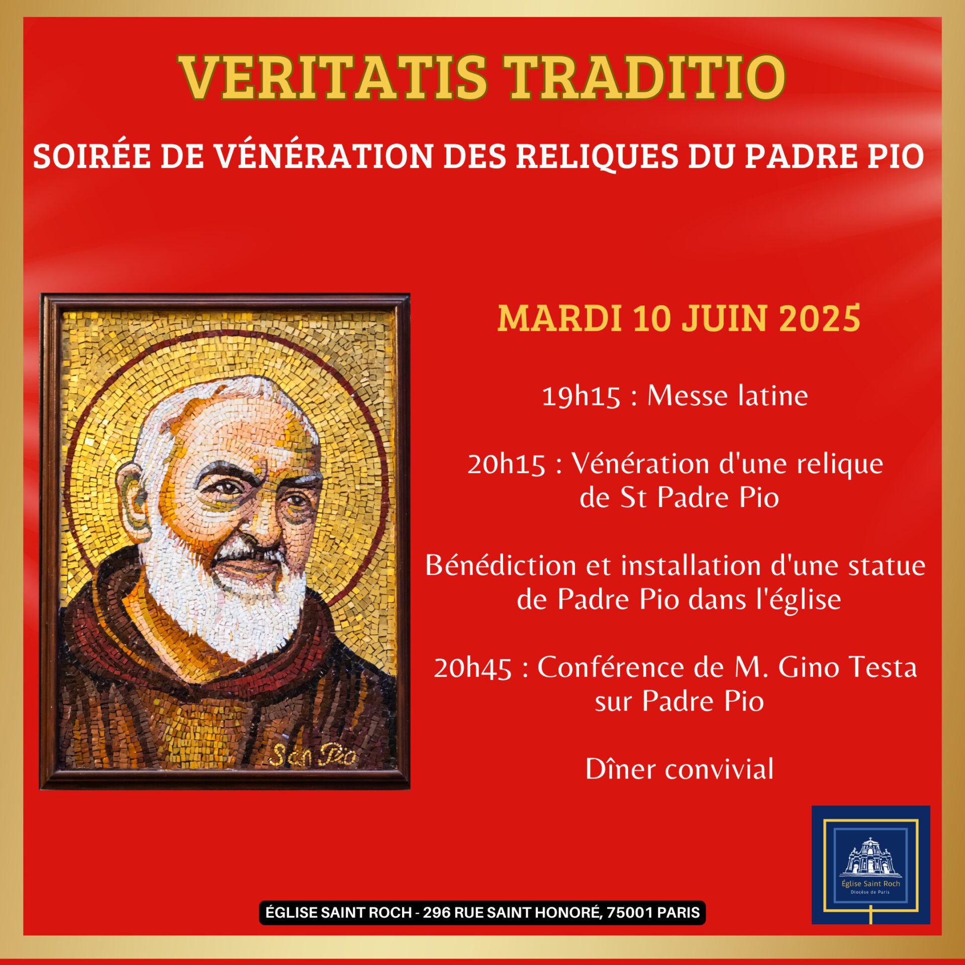 La paroisse Saint Roch (Paris) vous invite à la vénération de reliques de Saint Padre Pio ce mardi 10 juin.