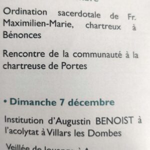 Le 6 décembre dernier, indique le bulletin du diocèse de Belley Ars, un Chartreux, le frère Maximilien Marie, a été ordonné prêtre à la Chartreuse Notre Dame de Portes à Benonces, fondée en 1115 et refondee en 1971.