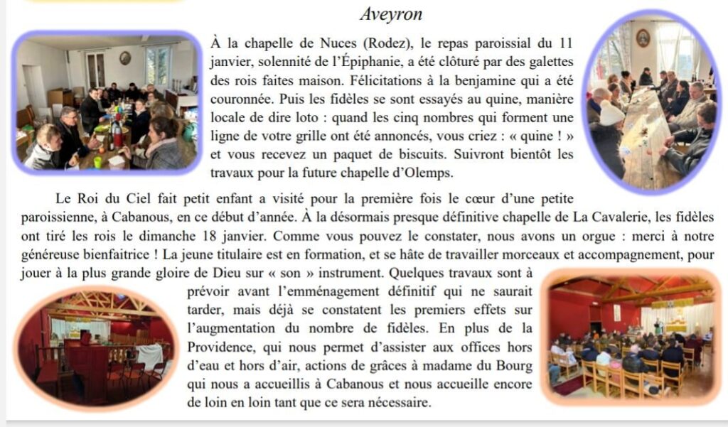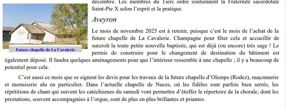 A Rodez, une chapelle va être aménagée à Olemps – 3 km du centre-ville, de l’autre côté de la rocade. Les devis ont été signés en novembre dernier, mais les travaux ne sont pas encore commencés, constate le bulletin du prieuré de Montpellier de février dernier.