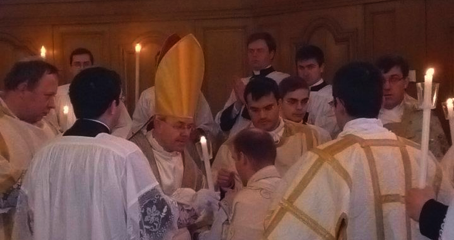 Samedi dernier, 11 février, en la fête de Notre-Dame de Lourdes, Mgr Athanasius Schneider a ordonné prêtre pour l’éternité l’abbé Sergiusz Orzeszko de l’Institut du Bon-Pasteur (IBP) en l’église Saint-jean Baptiste de Courtalain. Selon le site polonais Nowy Ruch Liturgiczny , l’abbé Sergiusz Orzeszko est le sixième prêtre polonais à être ordonné pour un institut dépendant de la commission pontificale Ecclesia Dei. Il célébrera d’ailleurs une première messe en l’église Saint-Clément de Varsovie le 11 mars prochain. Plus de photos ICI .