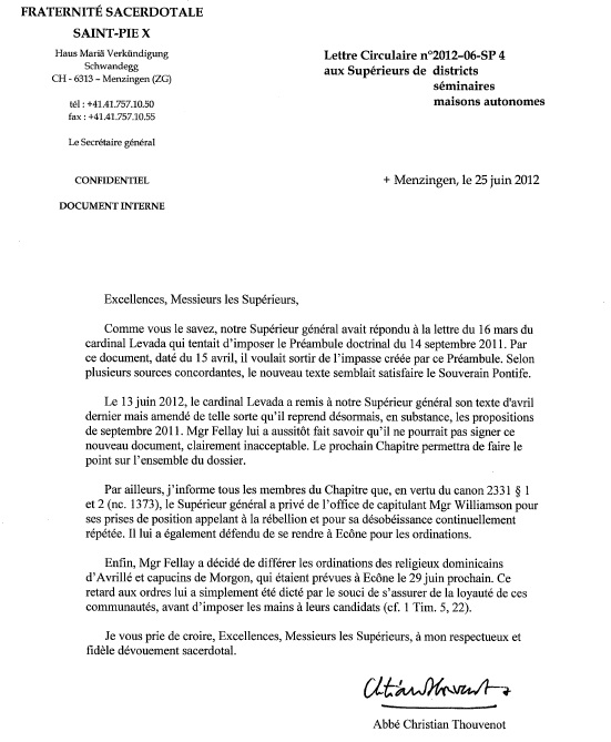 Toutes choses qui apparaissent clairement, ou en filigrane, dans la lettre du 25 juin, adressée par l’abbé Thouvenot, secrétaire général de la FSSPX, aux supérieurs de districts, séminaires et maisons autonomes, et qui a immédiatement « fuité » (d’abord en anglais) sur Internet. On en trouvera la copie ci-après.