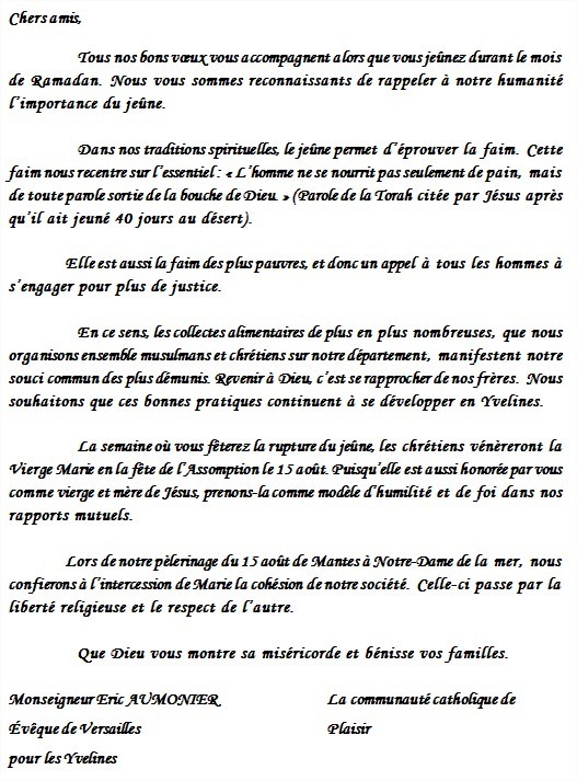 Mgr Eric Aumônier , évêque de Versailles, a publié ceci :