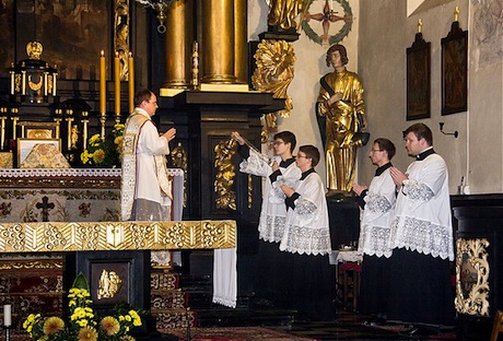 Organisée par la Polską Akademię Umiejętności (Académie polonaise des sciences) et la Akademię Ignatianum (Académie Ignatianum, ancienne École supérieure de philosophie et de pédagogie), une Messe votive en l’honneur de sainte Jeanne d’Arc, pour la Pologne et la France a été célébrée par l’abbé Wojciech Grygiel ( Fraternité Sacerdotale Saint-Pierre ) en l’église de la Sainte Croix ( Św . Krzyża ) de Cracovie (Pologne) le 19 novembre dernier, informe le blogue de Polonia Christiana que nous a aimablement signalé un lecteur que nous remercions.