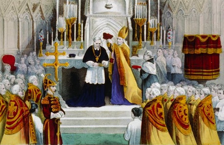 Sur cette image d’époque – qui est une “vision d’artiste” – le cardinal McCloskey reçoit la barrette des mains de Léon XIII…